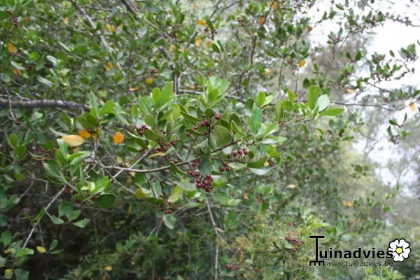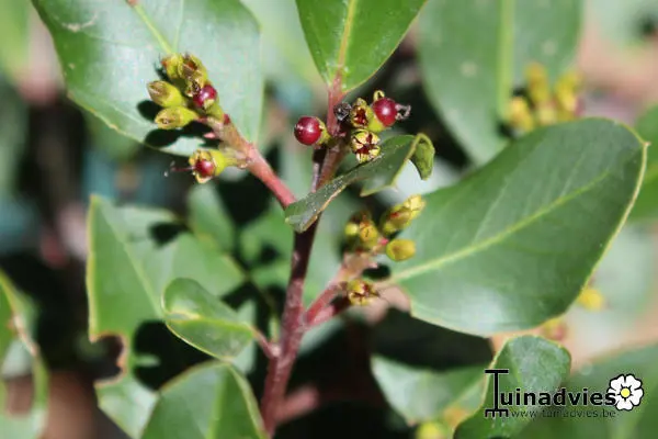 Rhamnus alaternus is een rechtop groeiende struik afkomstig uit Zuid-Europa met leerachtige bladeren.