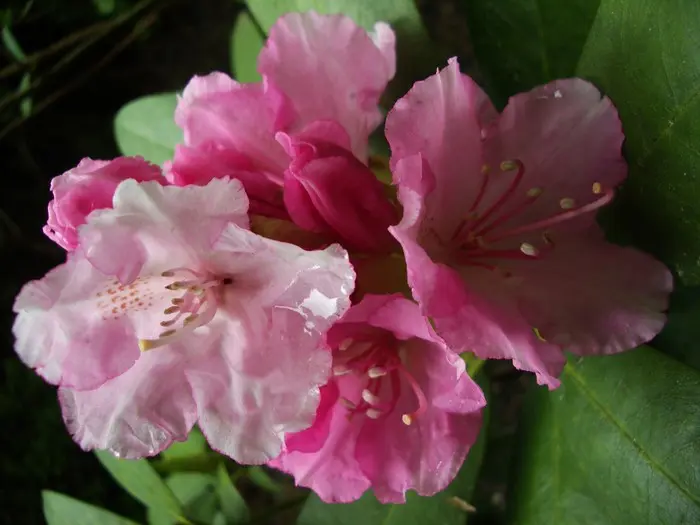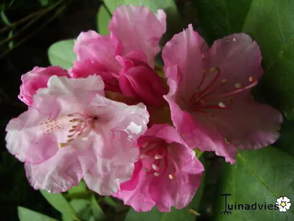 Rhododendron Yakushimanum 'Doc' heeft lancetvormige donkergroene bladeren en bloeit met verschillende tinten van roze.