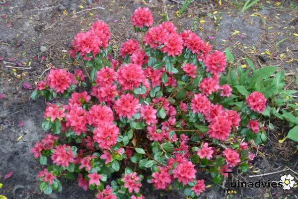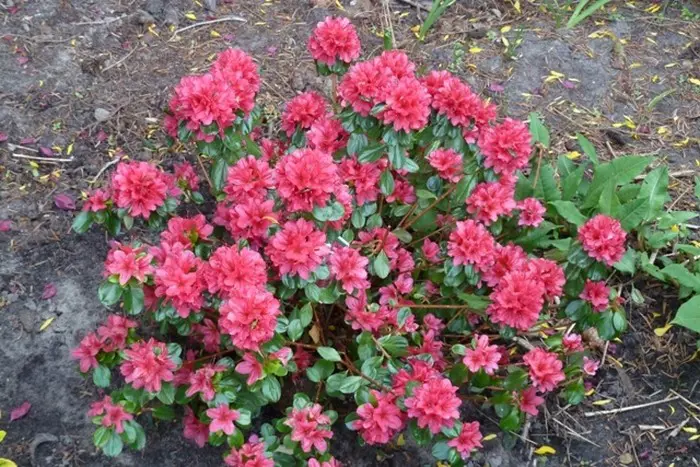 Azalea japonica 'Hino-crimson' is een compact bolvormige struikje en bloeit met klein karmijnrode bloemen.