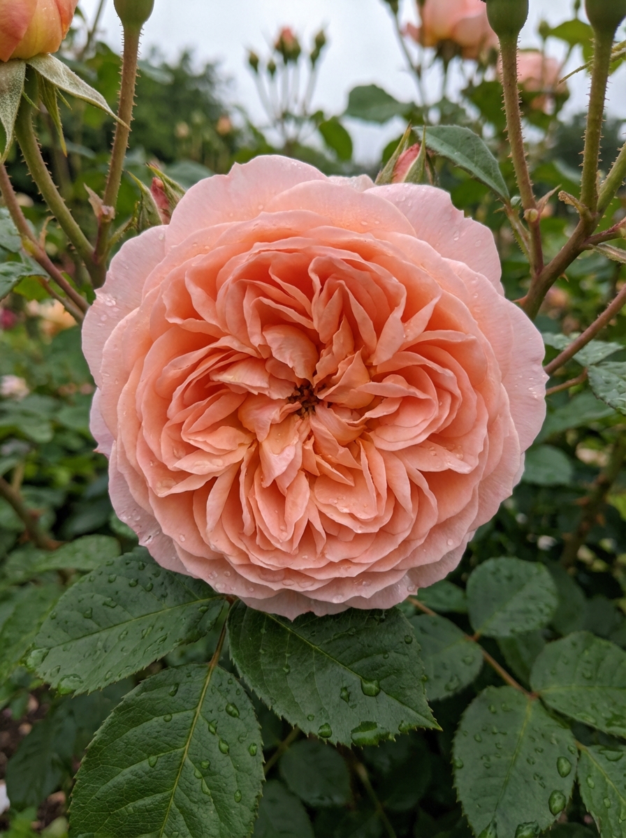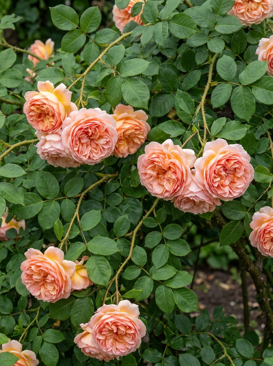 Rosa 'Abraham Darby' is een goed doorbloeiende, (bijna) doornloze roos met grote (11cm) komvormige bloemen.