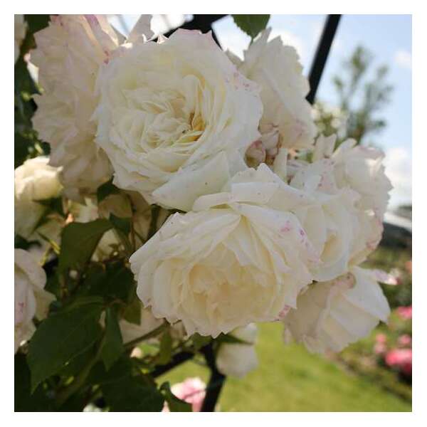 Het is een lichtgeurende, herbloeiende roos met trossen van dubbele witte bloemen.