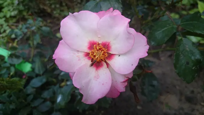 Een semi-dubbele, matig geurende roos. De cremekleurige bloem heeft een zachte roze blos verkleurend naar donkerder roze met in het centrum een dieproze ring rond het hart.