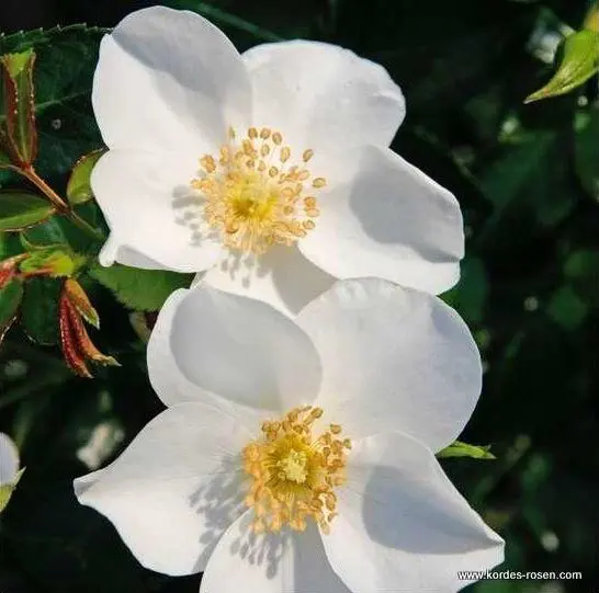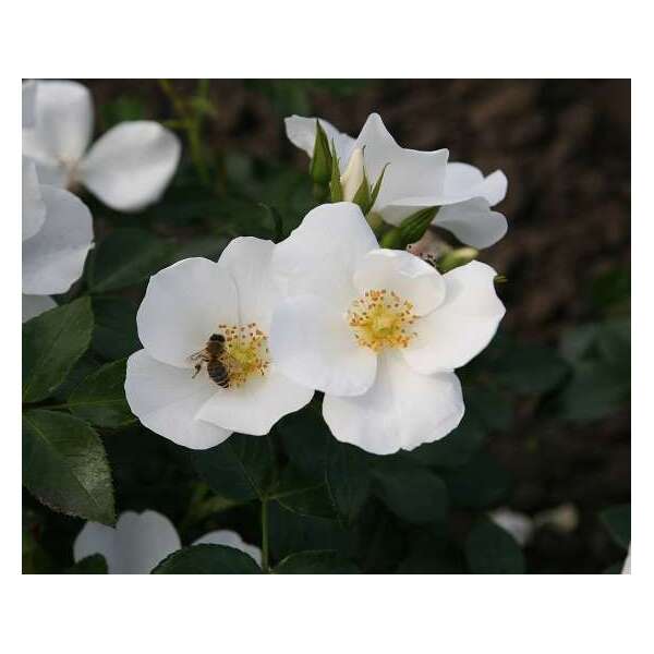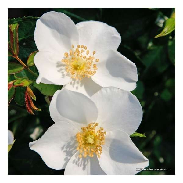 Rosa 'Escimo' is een herbloeiende roos met enkelvoudige zuiverwitte bloemen met in het centrum gele meeldraden.