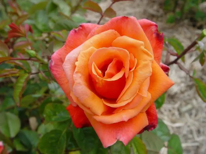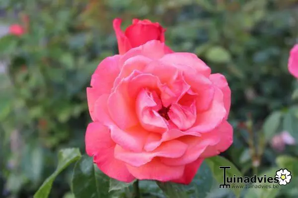 Een doorbloeiende theehybride met roze/oranje, sterk geurende bloemen.