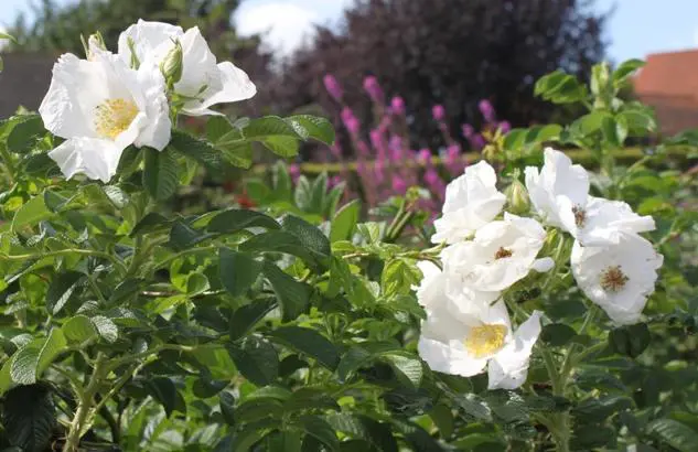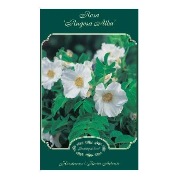 Rosa rugosa 'Alba' is ideaal voor een heg, het zijn dichte, doornige struiken met geurende witte enkele bloemen en opvallende gele meeldraden, die de ganse zomer bloeien tot eind augustus en nadien krijg je de glanzende rode bottels die eerder op kleine appeltjes lijken.