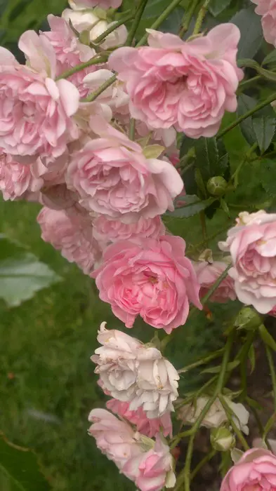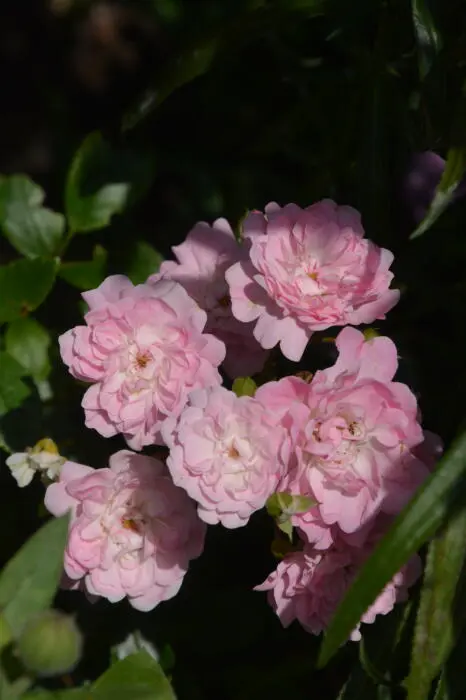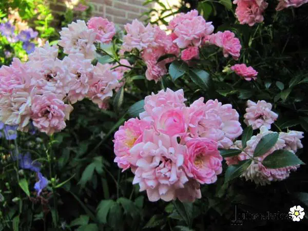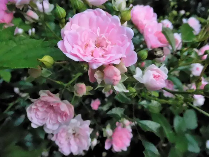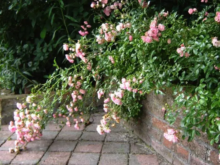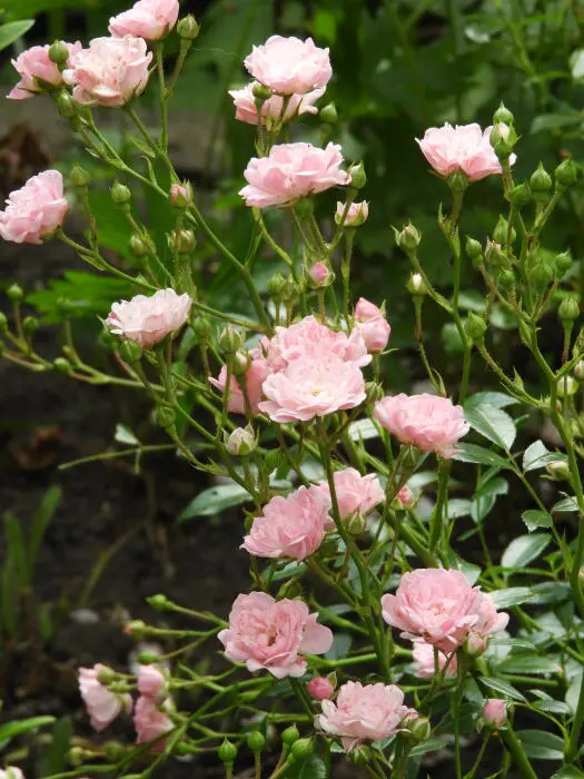 Een zeer gemakkelijke miniatuurroos overladen met kleine roze gevulde bloempjes.