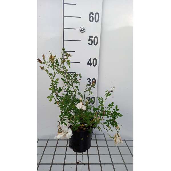 Een kruipende bodembedekkende roos met kleine witte dubbele roosjes in trossen.