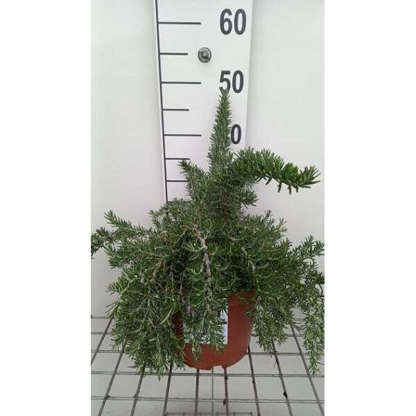 Rosmarinus officinalis 'Pointe du Raz' is een kruipende rozemarijn met donkergroene naaldvormige bladeren en lilakleurige bloempjes.