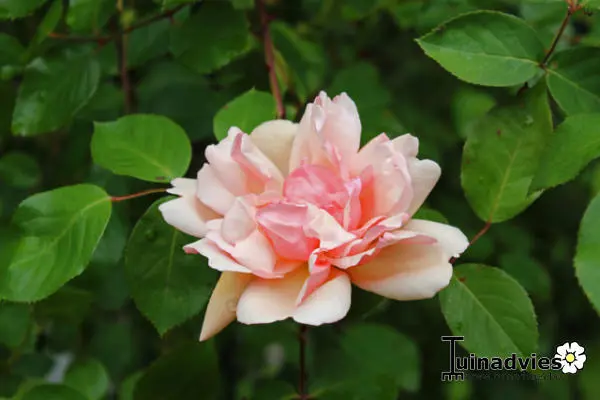 Het blad is glanzend donkergroen met rode nieuwe groei, dit staat echt mooi met de zalmkleur van de roos.