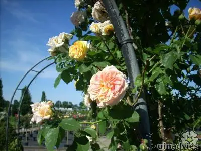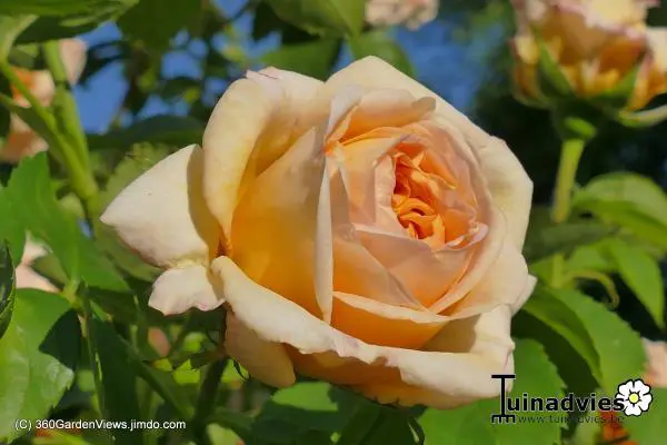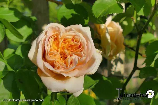 Sterk geurend gekwartierde volle bloemen, eerst oranje, goudgeel dan abrikoos en later verkleurend naar roze.