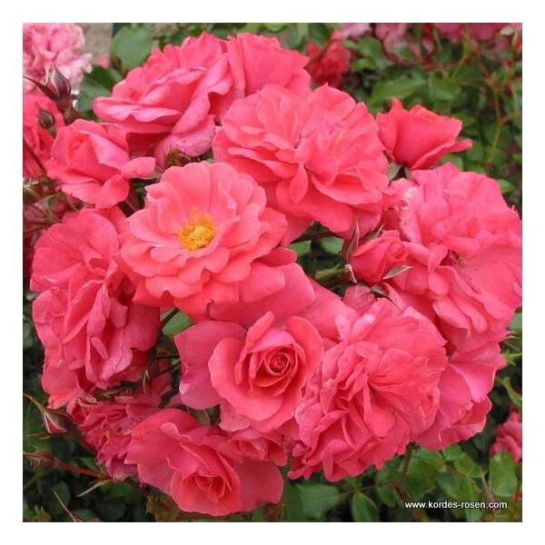 Rosa 'Bad Birnbach' vormt een compact bossige breedgroeiende lage struik met glanzende bladeren en trossen van zalmroze bloemen.