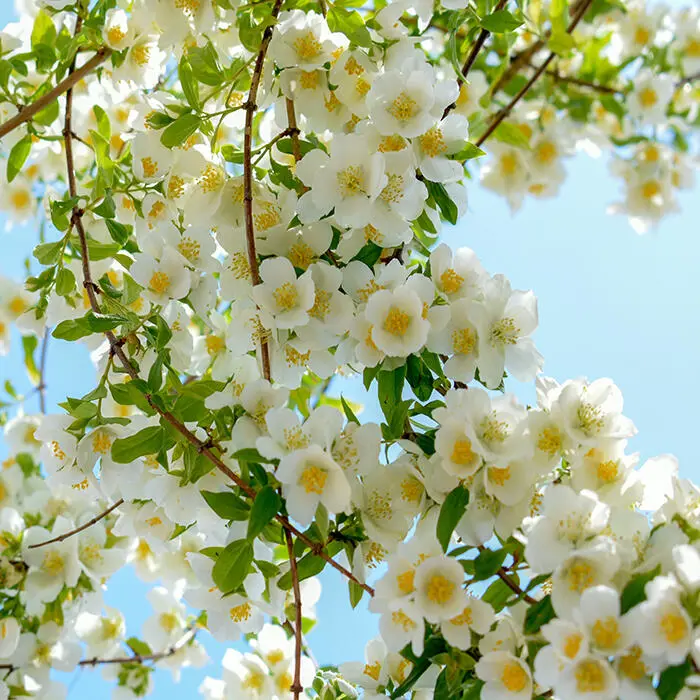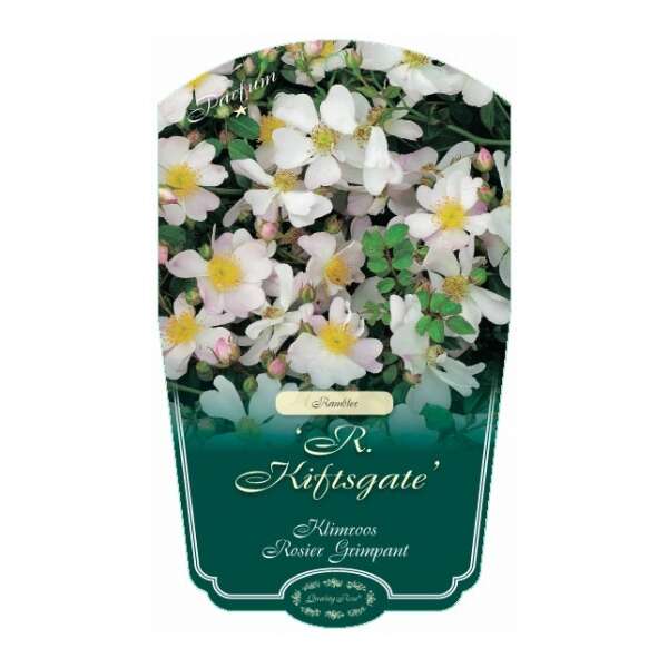 De bloemen van Rosa filipes 'Kiftsgate' zijn enkelvoudig, roomwit en worden in trossen van soms wel 100 geurige roosjes aan lange overhangende takken gedragen.