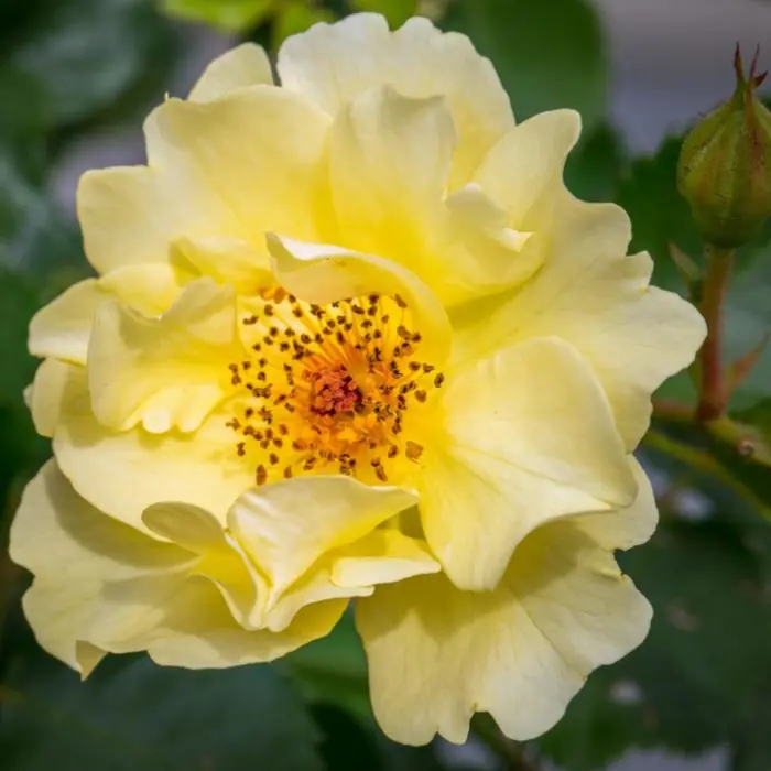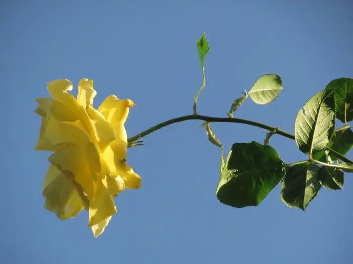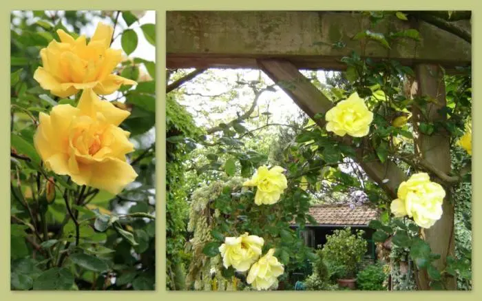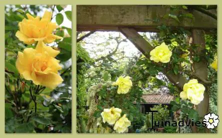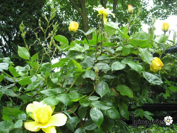 Een vroegbloeiende klimroos dat al in mei begint te bloeien met grote citroengele bloemen dat al snel verkleuren naar witgeel.