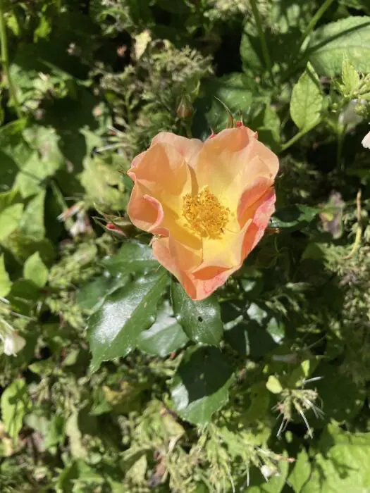 Rosa 'Jazz' bloeit met verschillende tinten van koperoranje tot geel, perzik en roze met een lichte geur.