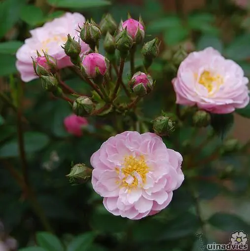 Rosa 'Little Rambler' is een rijkbloeiende lage klimroos (250cm) met sterkgeurende lichtroze roosjes en weinig doornen.