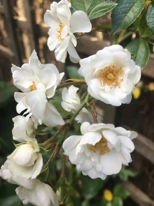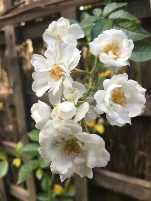 Rosa 'Paragon' is een sterk geurende, herbloeiende klimroos met grote trossen van kleine dubbele/semi -dubbele witte bloemen.