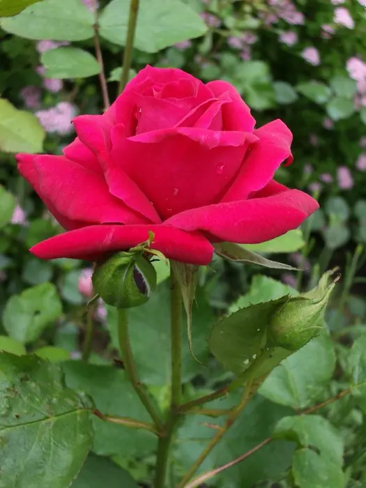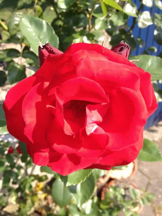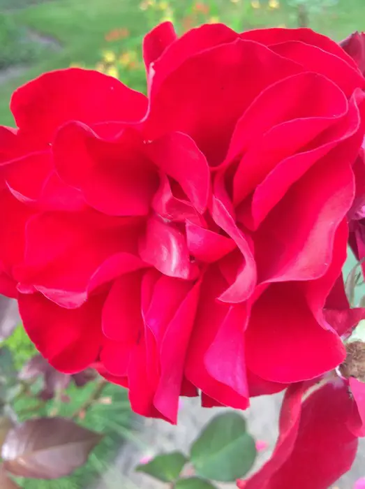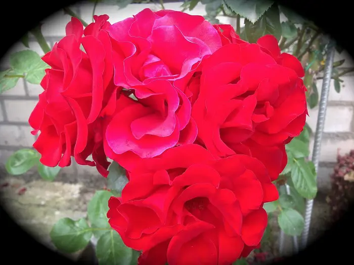 Een grote bossige struik met grote, donkerrode rozen, matige geur maar weersbestendig.