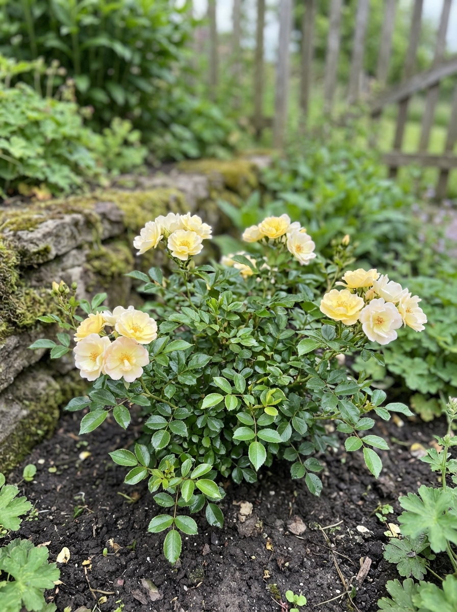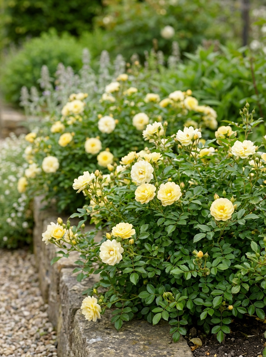 Rosa 'Sunny Rose' is een herbloeiende roos met trosjes van kleine dubbele lichtgele bloemen.