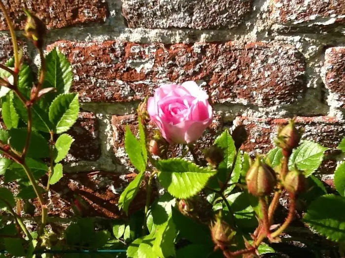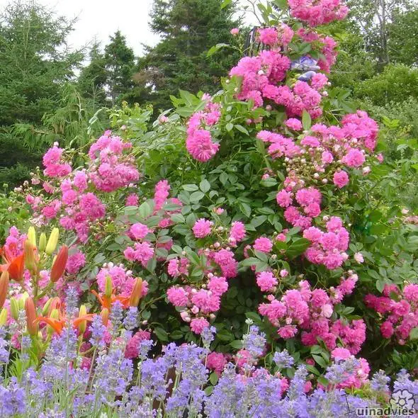 Een herbloeiende rambler met roze bloemen.