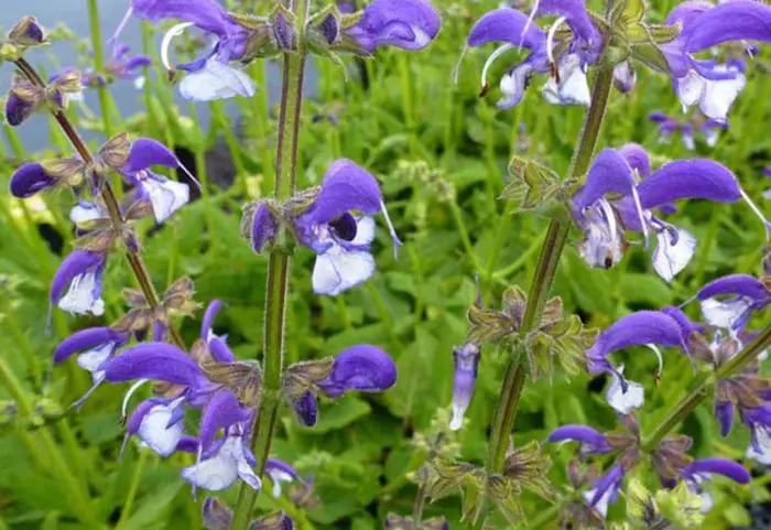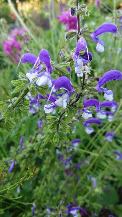Salvia 'Madeline' vormt een lange bloemaar met paarsblauwe bloemen met een contrasterende witte onderlip.