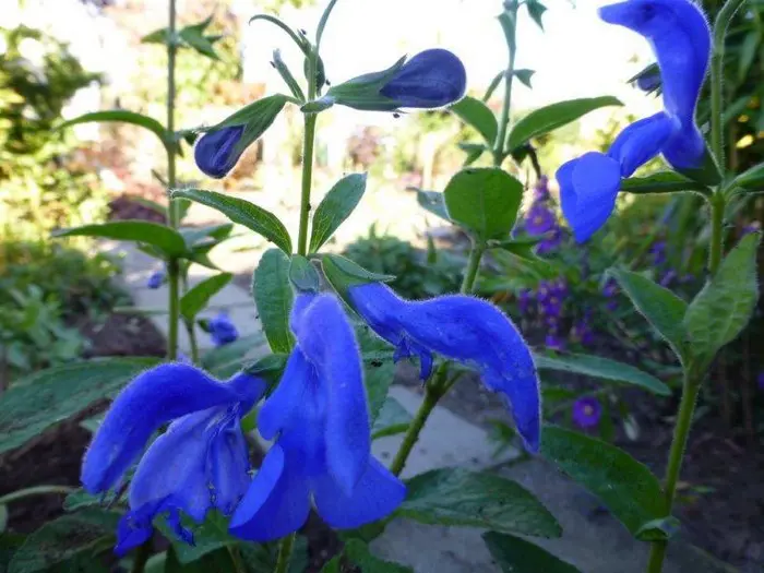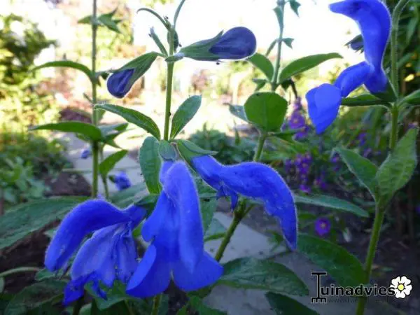 De bloemen zijn vrij groot vergeleken met de meeste andere salie. Ze staan paarsgewijs langs de stengel opgesteld en vertonen een zeer zuiver blauw, dat van op grote afstand zichtbaar is.