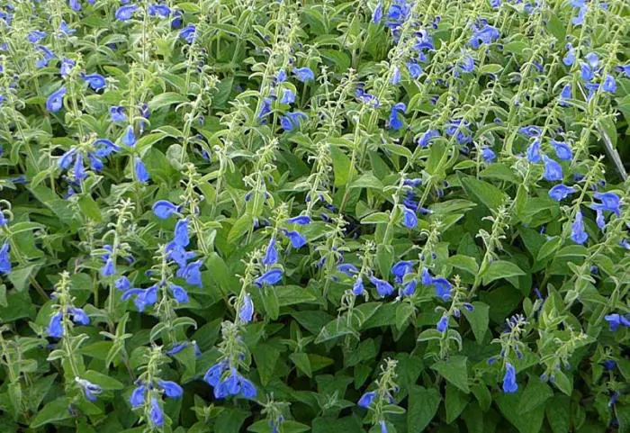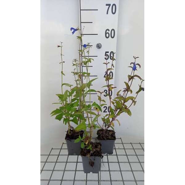 De hemelsblauwe bloemen zijn vrij groot vergeleken met de meeste andere salie. Ze staan paarsgewijs langs de stengel opgesteld.