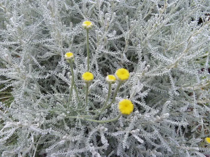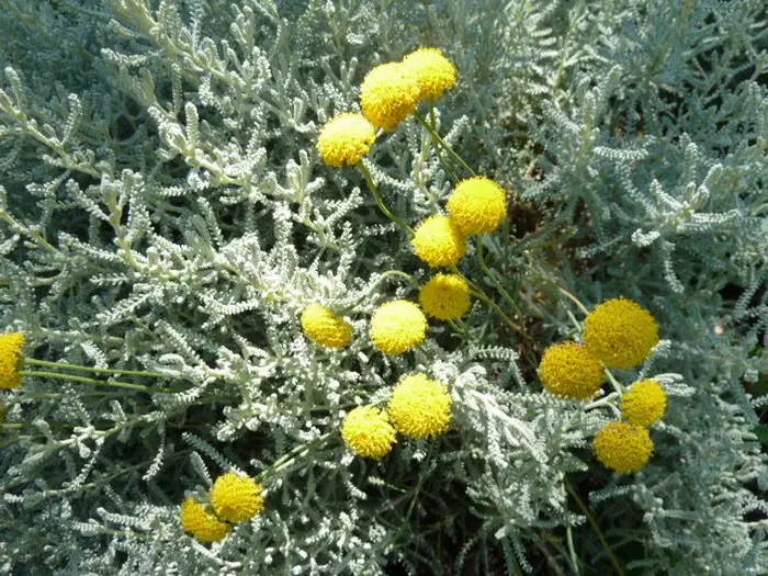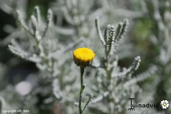 Santolina chamaecyparissus is een winterharde mediterrane struik, afkomstig uit Italië. Vormt een strak kussen van aromatische, fijn gesneden, zilvergrijs blad.