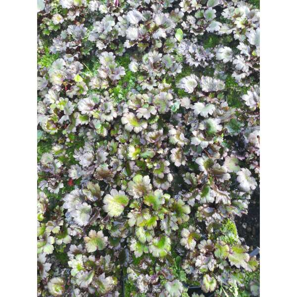 Saxifraga fortunei 'Black Ruby' vormt een rozet van glanzende purperzwarte, gelobde, ronde, getande bladeren.
