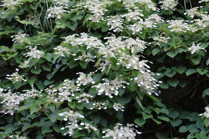 Schizophragma hydrangeoides is een zelfhechtende klimplant met breed ovale bladeren.