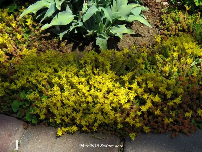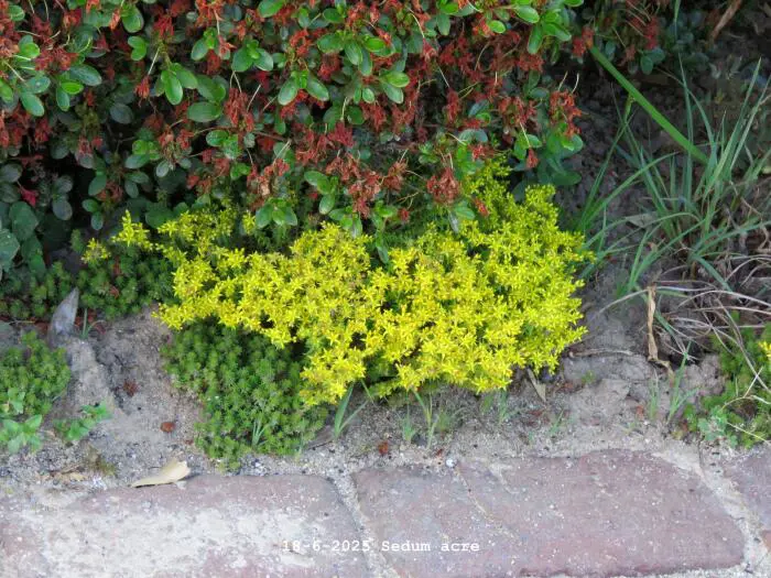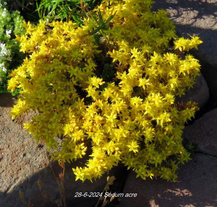 Sedum acre is een kleine vaste plant die ideaal is om vergeten hoekjes te bedekken met een tapijt van glanzende gele sterachtige bloempjes.