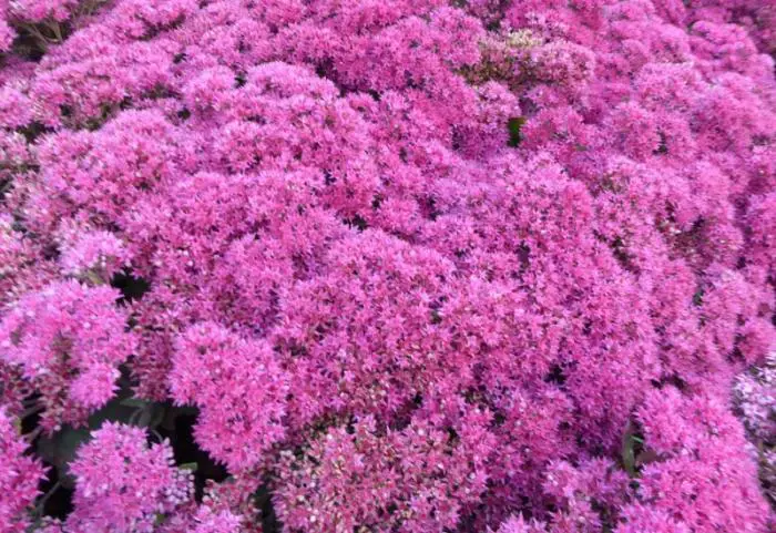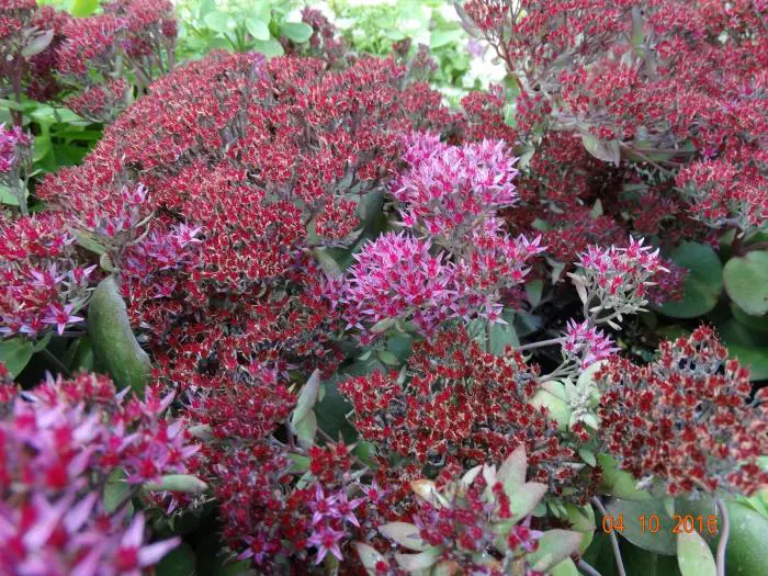 Sedum telephium 'Thunderhead' vormt rechtopgaande stengels met donker blauwgroene bladeren en bloeit met bloemhoofden van paarsroze sterachtige bloempjes.