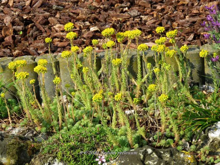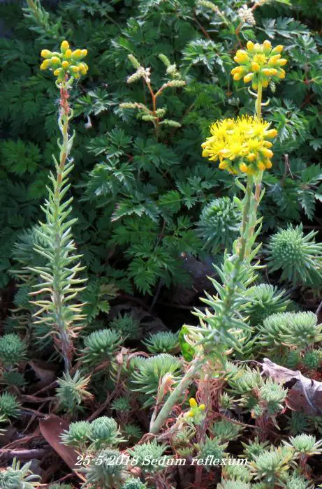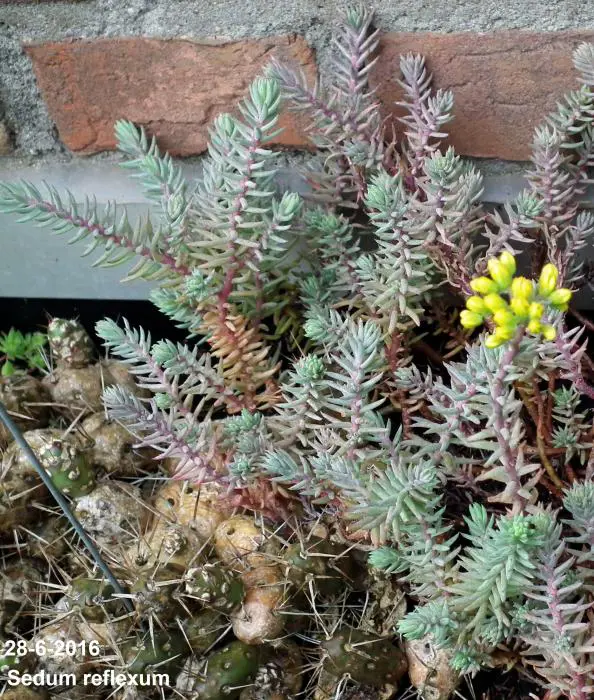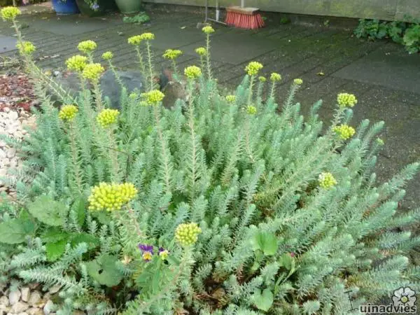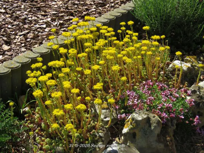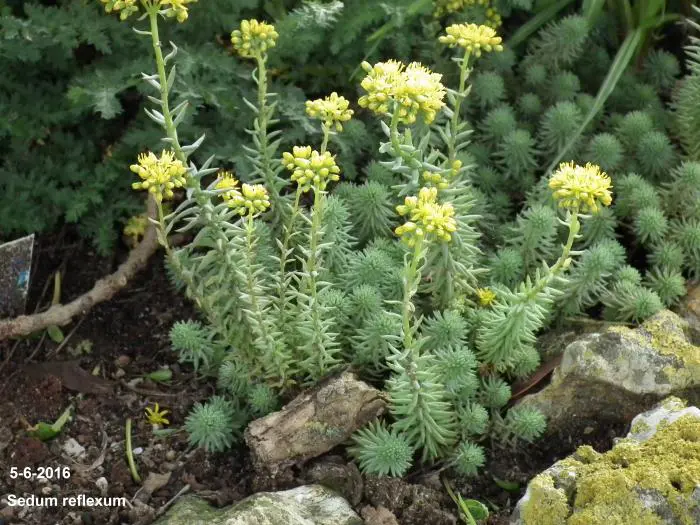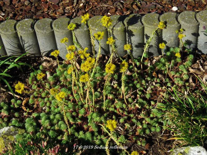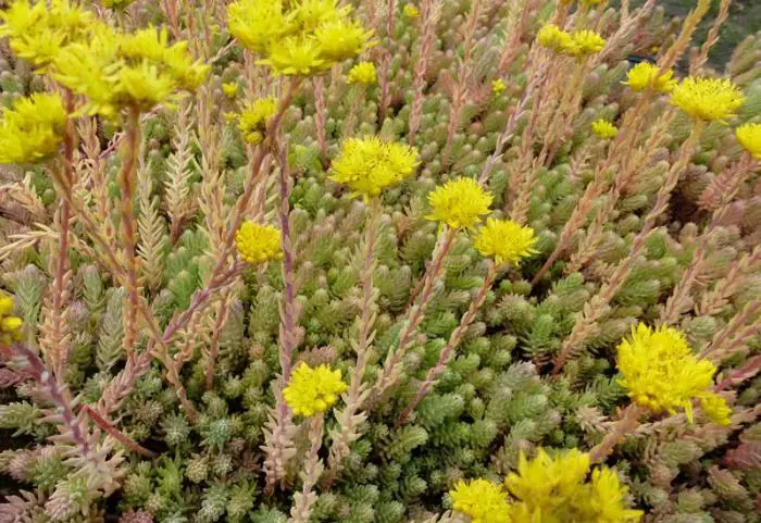 Goudgele bloempjes en een grijs/blauwgroen vlezig blad met soms een rood tintje.
