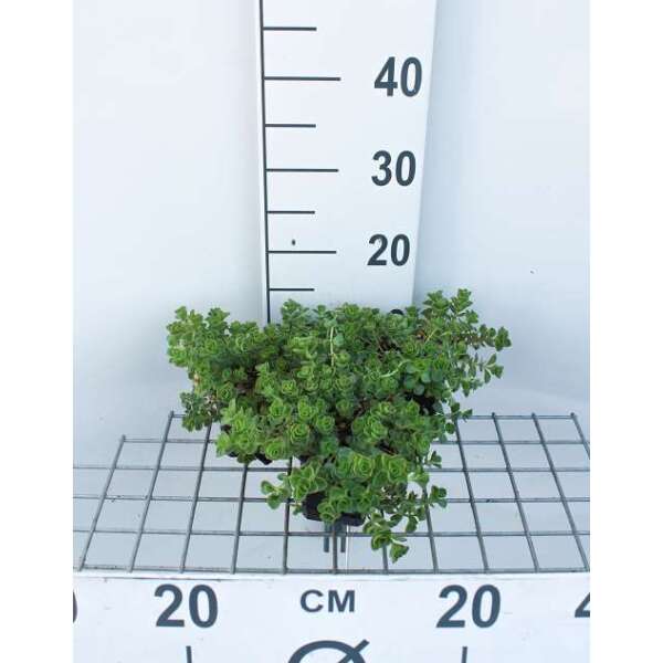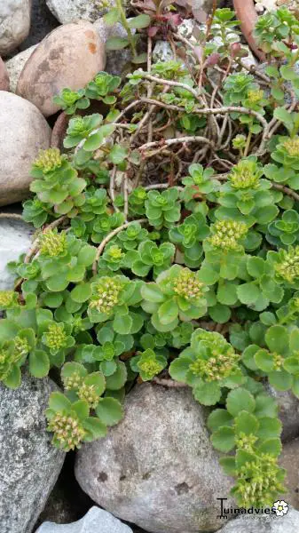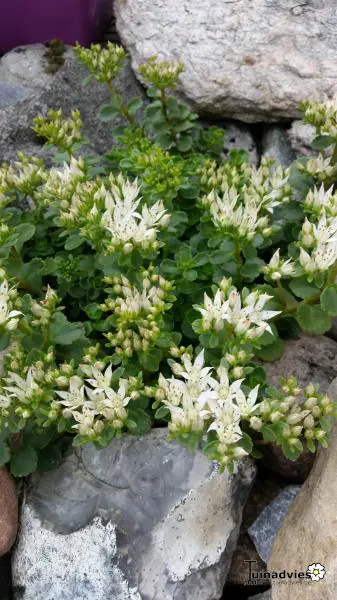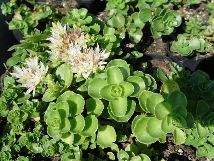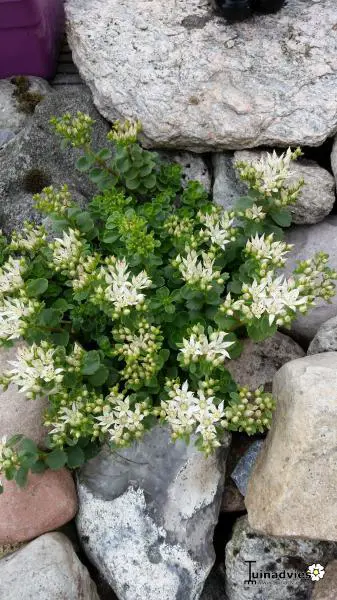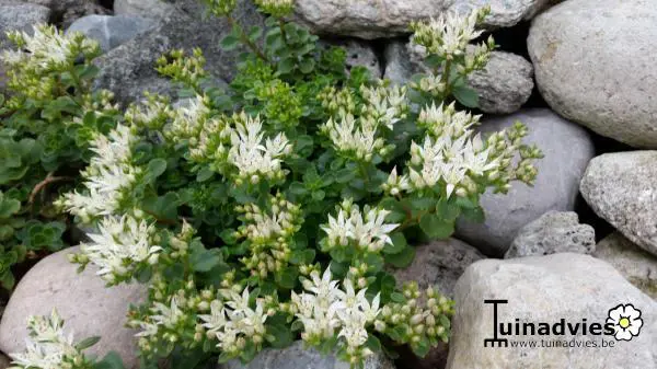 Sedum spurium 'Album Superbum' bloeit wit met grote samengestelde bloemen.