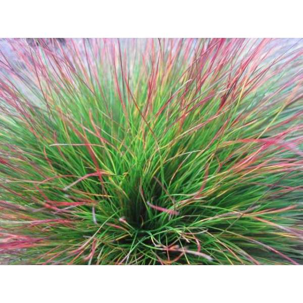 Festuca 'Walberla' vormt een pol met fijne groene bladeren H.20-30cm en met rode bloemaartjes H.40cm.