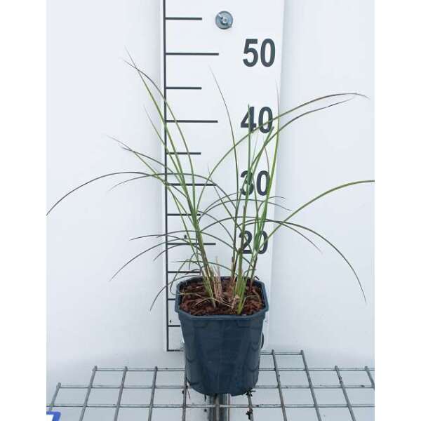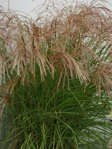 Miscanthus sinensis 'Red Cloud' vormt een compacte plant met lange smalle bladeren en opvallend aantrekkelijke rode bloempluimen.