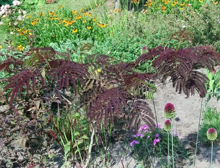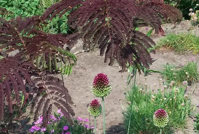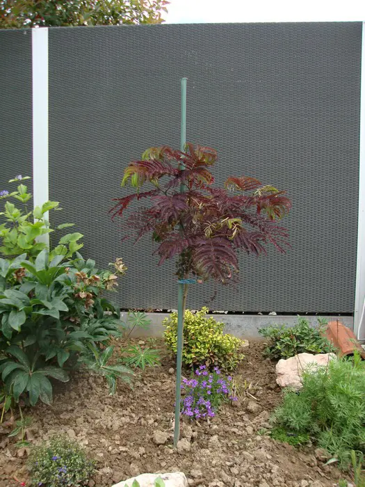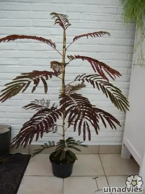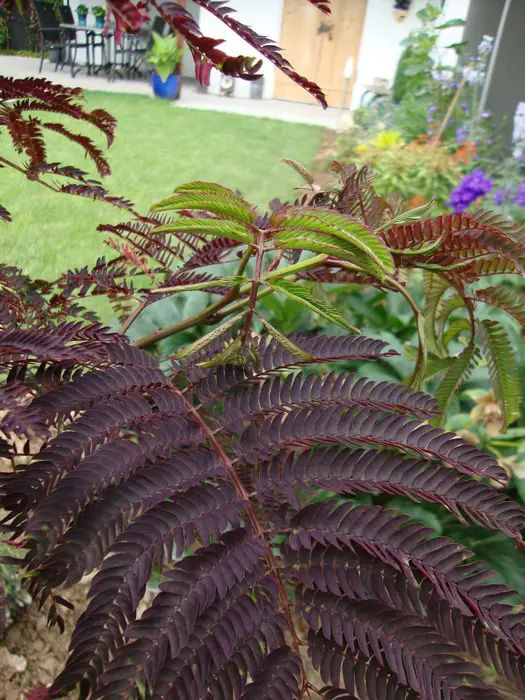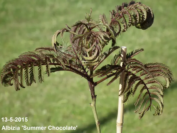 Albizia julibrissin 'Summer Chocolate' is een erg sierlijke boom met een parasolvormige kroon en prachtige gevederde bladeren die 's nachts dichtvouwen. Bij het uitlopen is het blad geelgroen om later te verkleuren naar donker paarsbruin met een zweem rood. Bloeit met grote rozerode bloembundels met lange zijdezachte witte meeldraden.