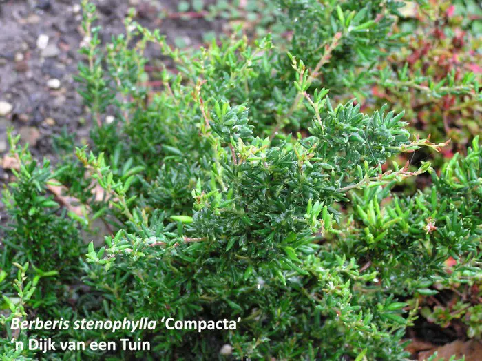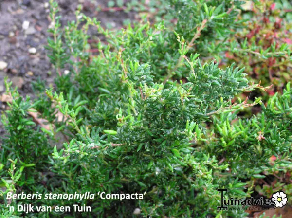 Berberis x stenophylla 'Corallina Compacta' is een prachtige doornige kleine heester met licht overhangende takken en kleine glanzende donkergroene blaadjes.