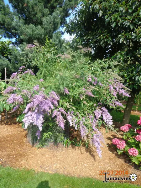 Buddleja davidii 'Dartmoor' is een bijzondere vlinderstruik met overhangende takken en grijsgroene langwerpige bladeren. Bloeit met lange dikke, vertakte lilapaarse bloempluimen.