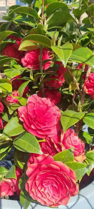 Camellia japonica 'Black Lace' is een compacte, opgaande heester met glanzend donkergroen blad en dubbele dieprode bloemen in het voorjaar.