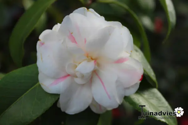 Camellia japonica 'Romiti' bloeit met grote goedgevulde witte bloemen, vaak met enkele roodpaarse strepen of vlekken.