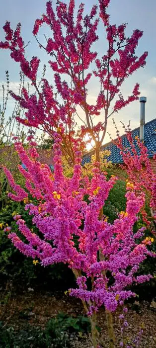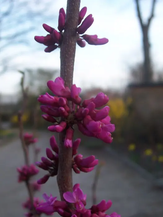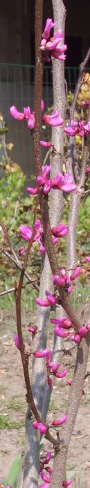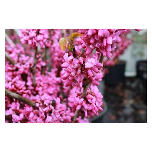 Bloeit met diep paarsroze bloemen op kale takken. Bloeit rijkelijker en met grotere bloemen dan de C. canadensis f. alba.