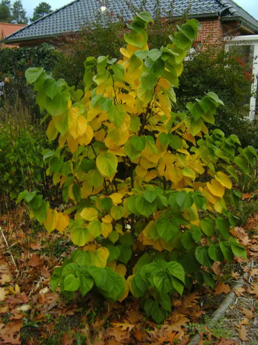 Cercis chinensis 'Avondale' is een compacte, opgaande, dicht vertakte struik of kleine boom met hartvormige, glanzende groene bladeren die geel kleuren de herfst.