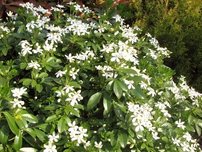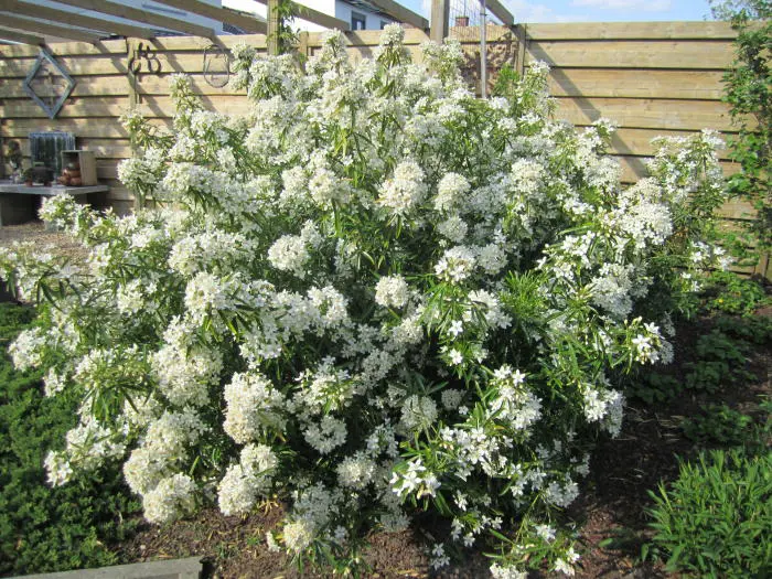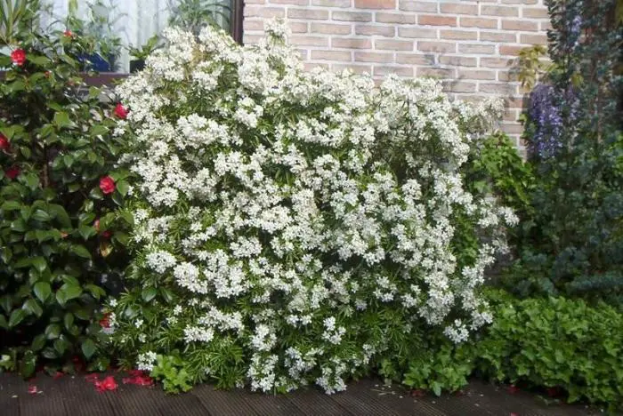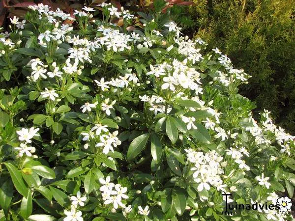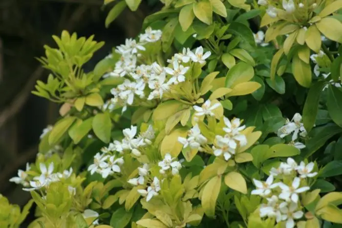 Bloeit met sneeuwwitte bloemen geurend naar oranjebloesems.
