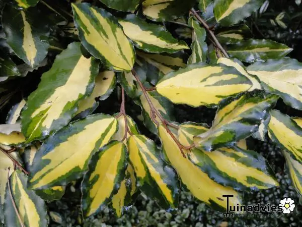 Elaeagnus pungens 'Maculata' heeft een brede opgaande groei met leerachige, ovale gele bladeren die onregelmatig groen gerand zijn. De onderkant van het blad is zilvergrijs en koperoranje gespikkeld.