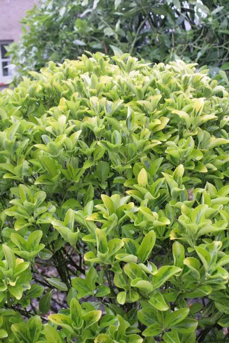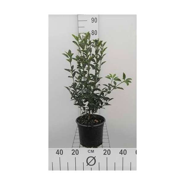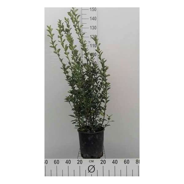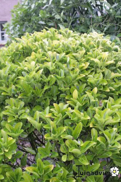 Een grote bossige struik met groenblijvend en dicht gebladerte. De kleine bladeren zijn intens groen, glanzend en leerachtig.