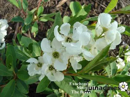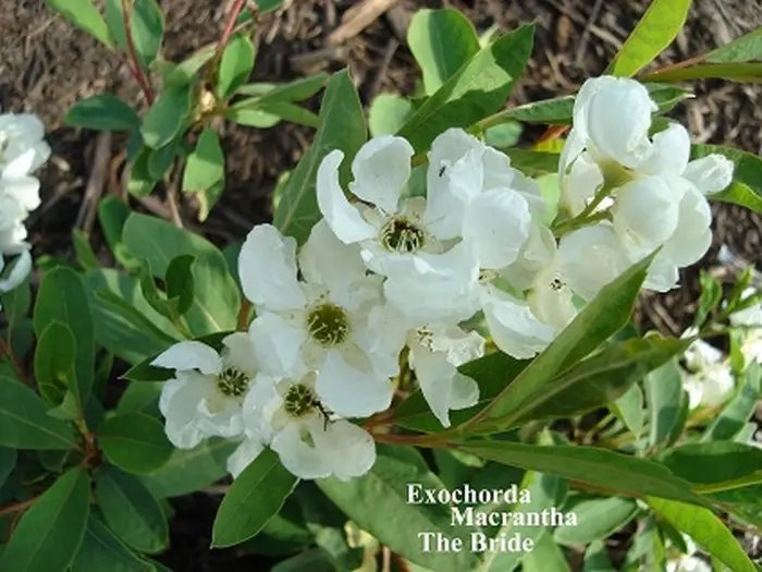 Exochorda x macrantha 'The Bride' is een bladverliezende, compacte struik, met soepele, overhangende takken met ovale groene bladeren, grijzer aan de onderkant.
