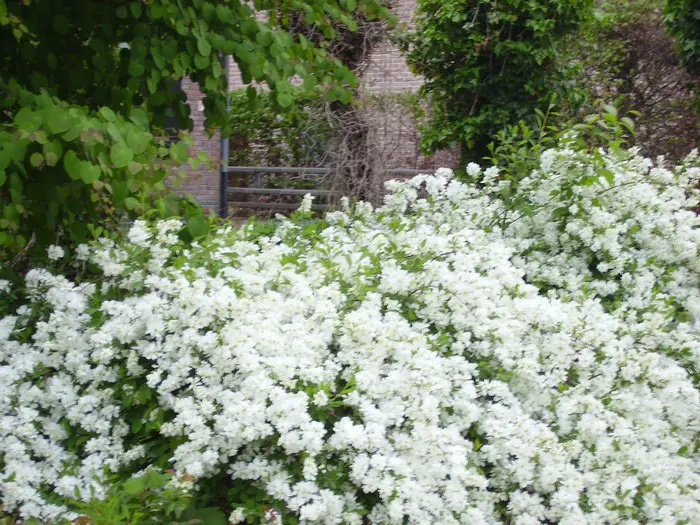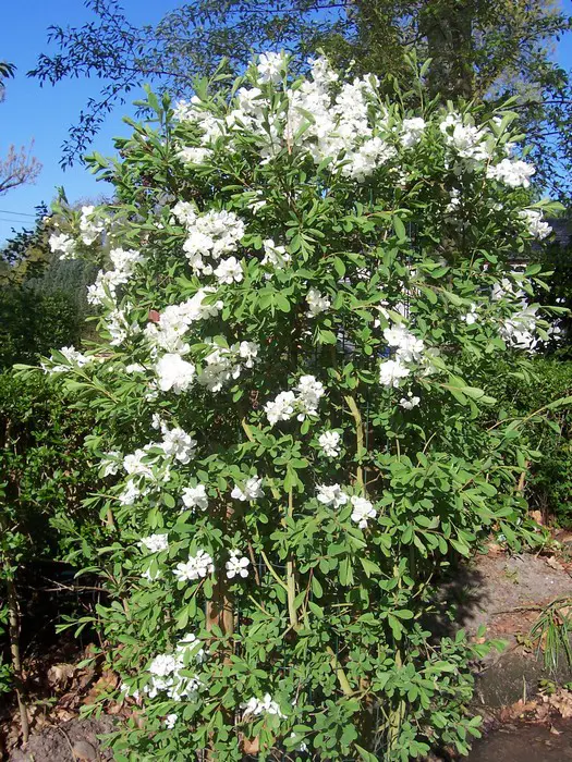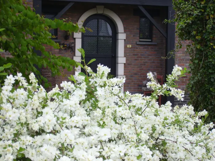 In het voorjaar zijn de takken overvloedig bedekt met halfgevulde sneeuwwitte bloemen.