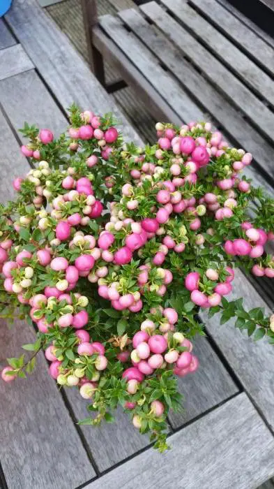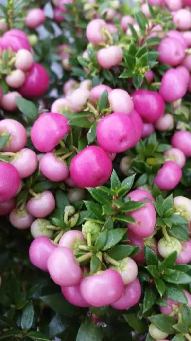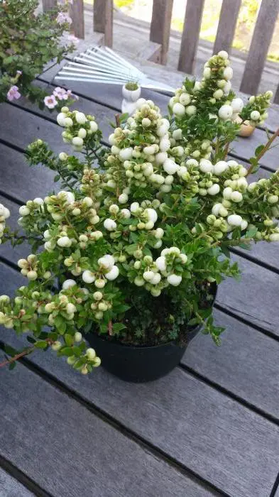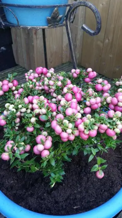 Gaultheria mucronata afkomstig uit Chili en Argentinië, is een dicht vertakte klein struikje met leerachtige stekelige blaadjes bloeiend met witte/roze kleine bloemen. Na de bloei volgen de ronde wit of roze bessen.