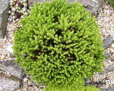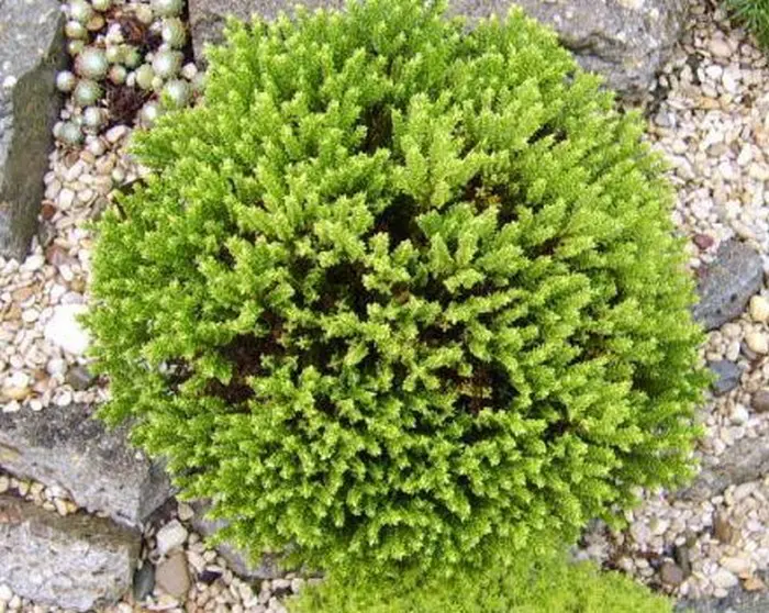 Hebe 'Green Globe' is een compact bolvormig struikje met eironde smaragdgroene blaadjes en een rozig witte bloei.
