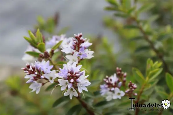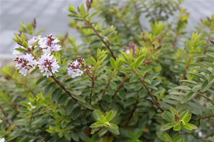 Hebe 'Pearl Paradise' is een klein bolvormig heestertje met grijsgroene bladeren en lilaroze/rozewitte bloemtrosjes.
